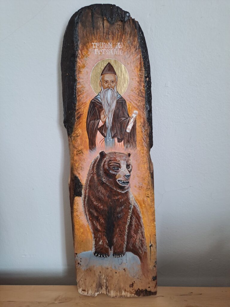 Det berättas i källorna att Trifon bakade och medan han var upptagen med annat kom björnen in i huset och började äta av degen. Helgonet bad björnen i Jesu namn att lämna honom ifred. Efter den händelsen stördes inte klosterområdet  av några vilda djur, utan renarna fick beta ifred.Jag tycker om den berättelsen. Den visar på att en människas helgelseprocess leder till att man lever i närmare harmoni med naturen.